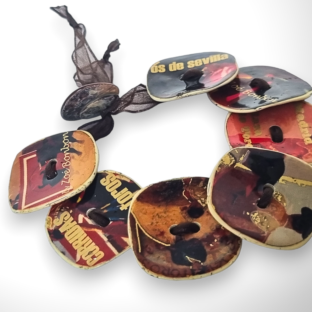 Ce bracelet présente un dessin de torero finement imprimé sur nacre, combinant charme et singularité.