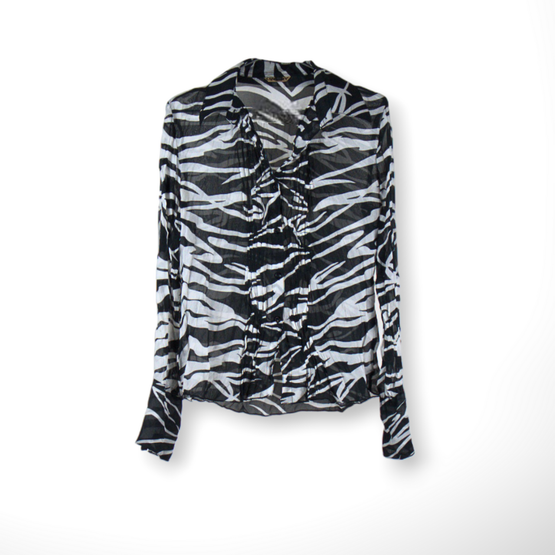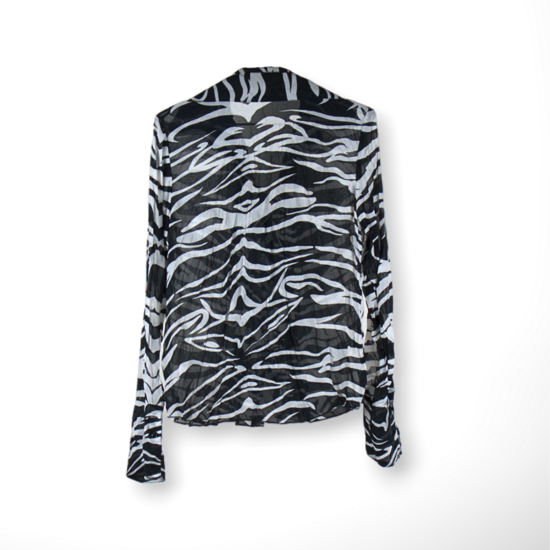 Chemisier vintage au croisement entre la mode disco fin 70 et les premières tendances animal print années 80 avec son imprimé zébré typique 80'S, et son col pelle à tarte 70'S parfait pour apporter une touche rétro à votre garde-robe.