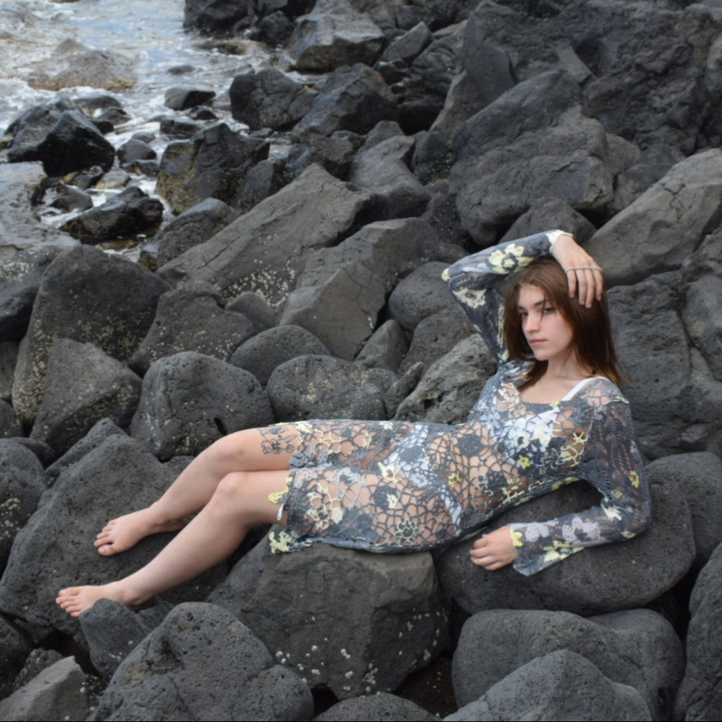 Robe en crochet gris rehaussée d’une note lime, idéale pour le layering ou à porter lors de vos journées ensoleillée.