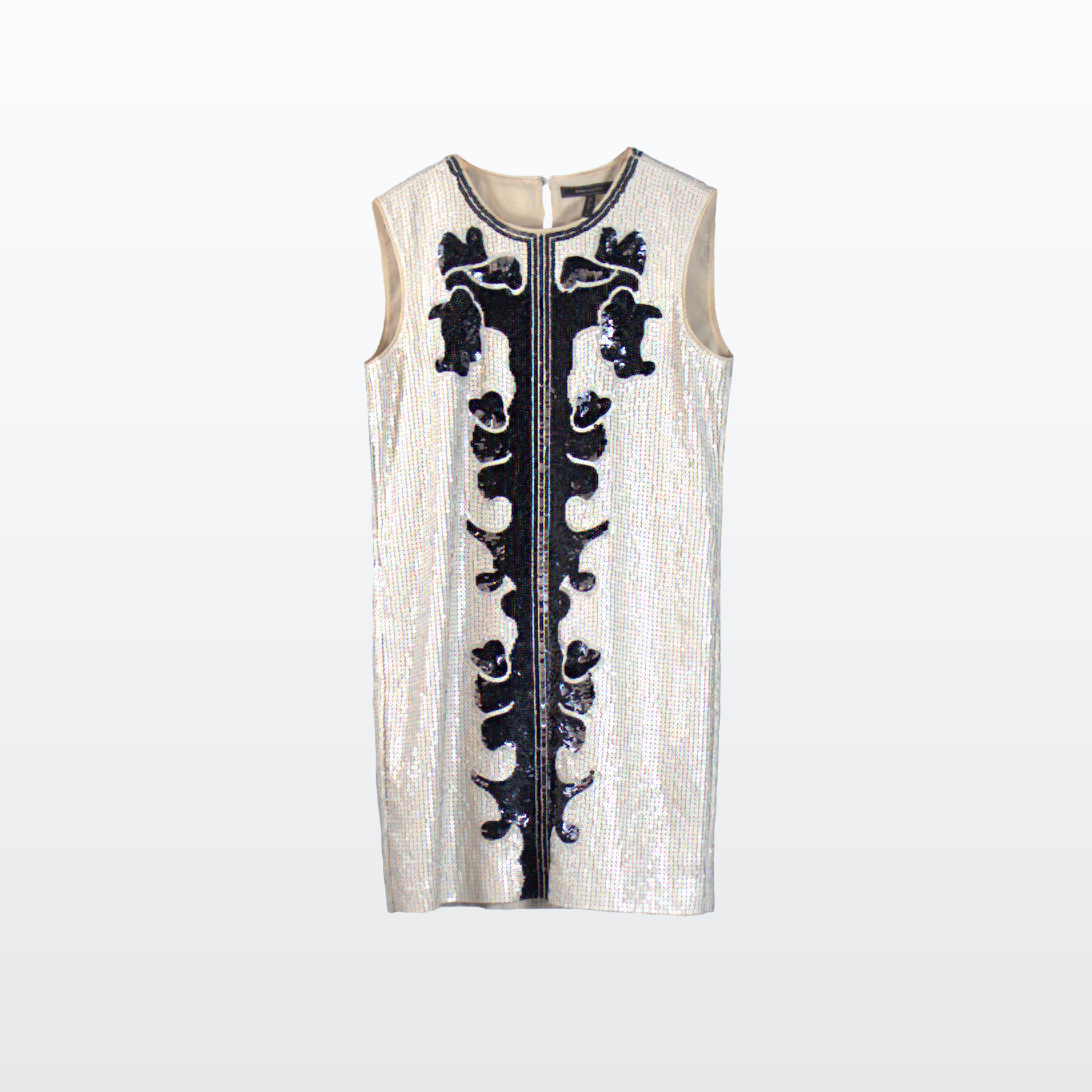 Robe BCBG Maxazria, entièrement brodée de sequins scintillants, parfaite pour illuminer vos soirées. Sa coupe droite met en valeur la silhouette avec finesse, tandis que les détails brillants apportent une touche glamour.